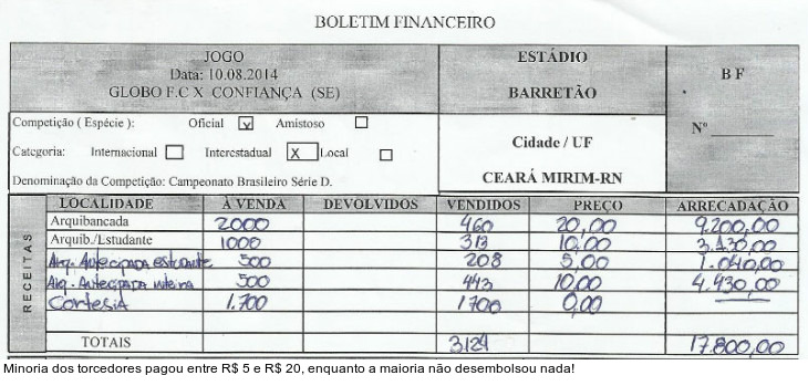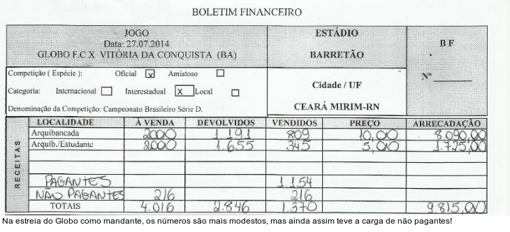 Apesar do argumento de Canindé Pereira, basta acessar o borderô da 2ª rodada da Série D para perceber que no jogo entre Globo e Vitória da Conquista também houve cortesias. Na oportunidade, porém, os números foram mais modestos. Foram 216 torcedores não pagantes e 1.154 que colocaram a mão no bolso para acompanhar o triunfo, por 3 a 1, sobre o clube baiano.Na realidade...