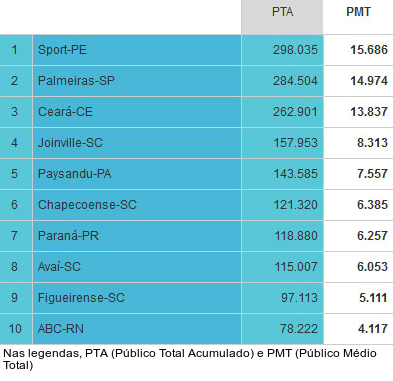 Enquanto isso, Chapecoense e Figueirense - os outros dois clubes que subiram para a Série A - aparecem foram do Top 5. Vice-campeão da Série B, a Chapecoense terminou na 6ª colocação, com média de 6.385 pagantes. O Figueirense, por sua vez, ocupa o 9º lugar (5.111).Vazio!