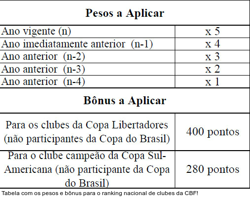 j) Considerando que a Copa do Brasil até 2012 foi disputada em seis fases, não será considerada para o referido período a pontuação referente à fase 1 da Tabela 2.