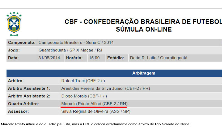 Detalhe: em 19 de setembro de 2013, o Sr. Goool fez uma matéria a respeito e chegou a alertar a CBF sobre o erro, mas nada foi feito. A lambança da entidade nacional não para por ai. O árbitro paulista Marcelo Prieto Alfieri é considerado do quadro do Rio Grande do Norte.Ele esteve de quarto árbitro na partida entre Guaratinguetá e Macaé, pela Série C, e a frente do seu nome estava a sigla RN. Há ainda a pisada de bola no quadro do árbitro Bráulio da Silva Machado. Ele pertence a Santa Catarina, mas foi considerado do Mato Grosso do Sul na partida da Série A entre Chapecoense e Bahia.O Sr. Goool entrou em contato com a ouvidoria da CBF em 4 de junho e recebeu a seguinte resposta: "Agradecemos sua mensagem a qual está sendo repassada para conhecimento da Comissão de Arbitragem da CBF". Até agora, nada foi feito.
