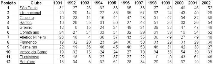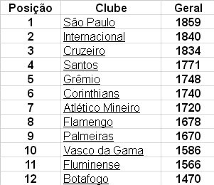 Três vezes campeão nacional, o Colorado acumula 1.840 pontos. O Inter participou de todos os torneios nacionais. O mesmo acontece com o Cruzeiro - atual bicampeão brasileiro - e na 3ª colocação do ranking de pontos. A Raposa acumula 1.834 pontos. Apenas São Paulo e Corinthians, neste Top 12, não disputaram todos os torneios nacionais.O Corinthians ocupa a 6ª colocação com 1.740 pontos. Mas ainda assim, o Timão está bem a frente do lanterna Botafogo. Rebaixado no Brasileirão, o Glorioso soma 1.470 pontos. As últimas colocações, por sinal, são de clubes do Rio de Janeiro. Neste ranking foram considerados apenas os quatro chamados grandes de São Paulo e do Rio de Janeiro, além dos dois maiores de Minas Gerais e Rio Grande do Sul.