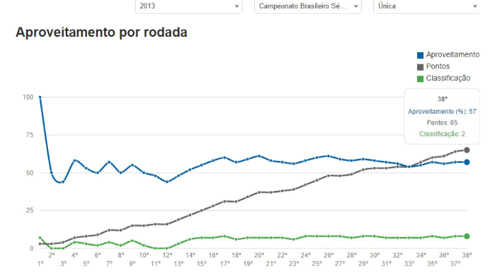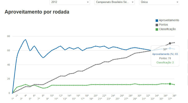 No Sr. Goool, basta clicar no escudo do seu clube do coração para ter todas as informações e estatísticas da atual temporada e das últimas edições. Na aba "aproveitamento", por exemplo, há os dados sobre a pontuação e classificação do clube rodada a rodada no campeonato escolhido.